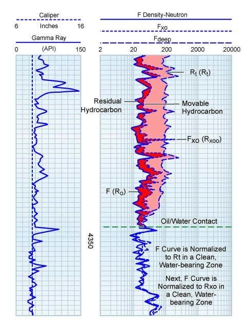 In the water-bearing section, the normalized F curve, being Ro, coincides with the Rt curve. In the hydrocarbon-bearing section, the Rt separates from Ro. This separation can be quantified in water saturation units by using an appropriate logarithmic scaler (Figure 3).